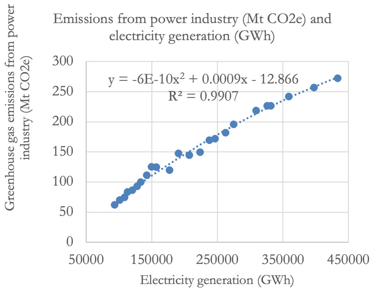 Figure 3. Electricity generation in GWh (International Energy Agency, n.d.) and Emissions from the power industry (CO2, CH4 and N2O) in Mt CO2e (sum of EN.GHG.CO2.PI.MT.CE.AR5, EN.GHG.CH4.PI.MT.CE.AR5, EN.GHG.N2O.PI.MT.CE.AR5) (World Bank, n.d.-a).