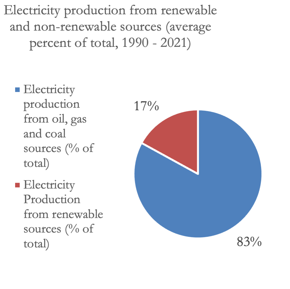 Figure 2. Electricity production from renewable sources, including hydroelectric (EG.ELC.RNWX.ZS) and non-renewable sources, including oil, gas, and coal as a percentage of total averaged over 1990 to 2021 (EG.ELC.FOSL.ZS) (World Bank, n.d.-a).