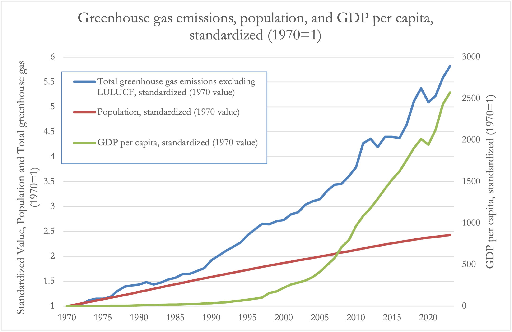 Figure 1. Indonesia’s Total Greenhouse Gas Emissions Excluding LULUCF (Mt CO2e) (EN.GHG.ALL.MT.CE.AR5), Population, total (SP.POP.TOTL) and GDP per capita (current LCU)(NY.GDP.PCAP.CN) from 1970 to 2023, standardized to 1970 =1 (World Bank, n.d-a). A secondary axis (right axis) was added for GDP per capita due to its much larger scale (an increase of over 2500 times) relative to emissions and population (left axis).