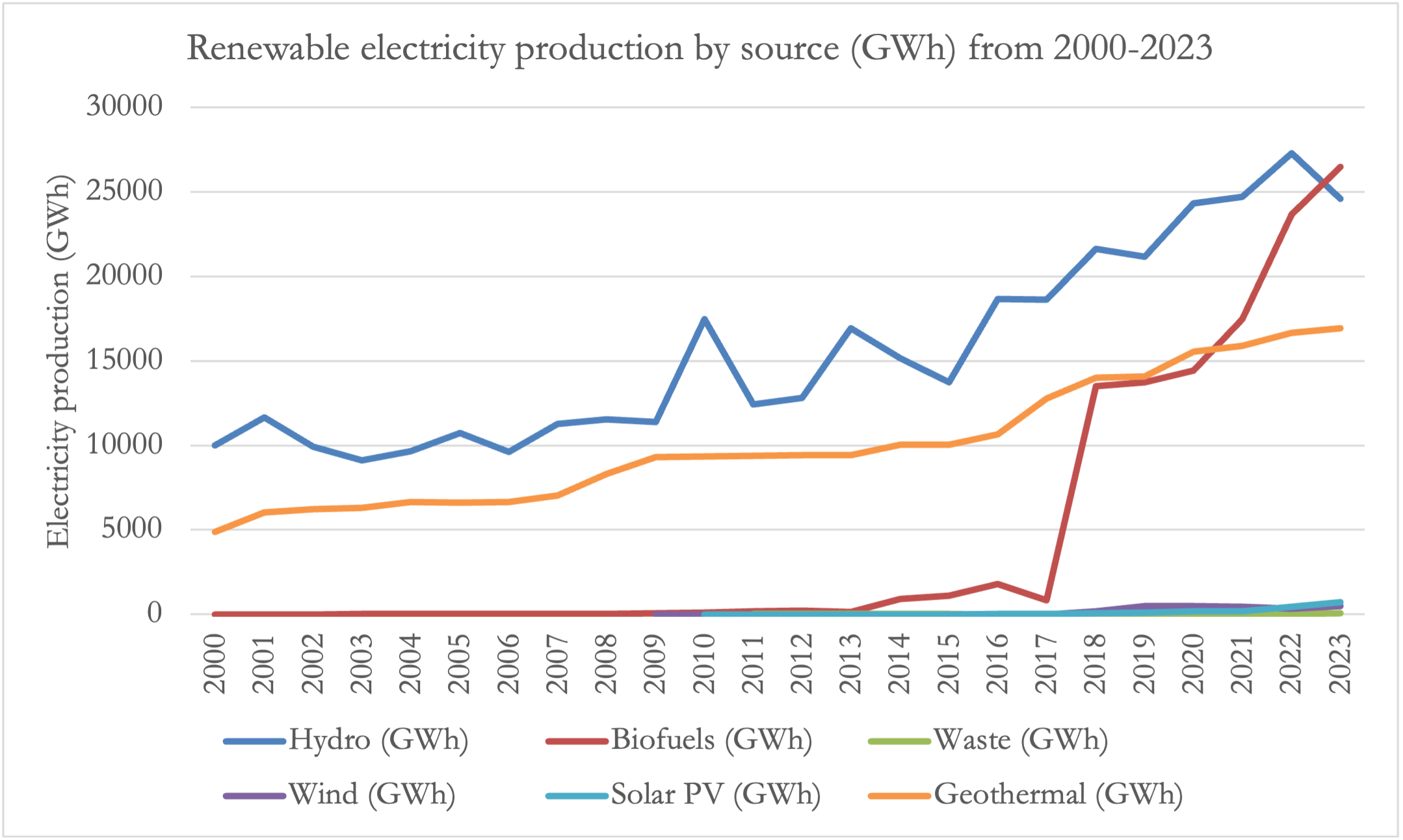 Figure A. Renewable electricity production by source (GWh) from 2000-2023 (International Energy Agency, n.d.).