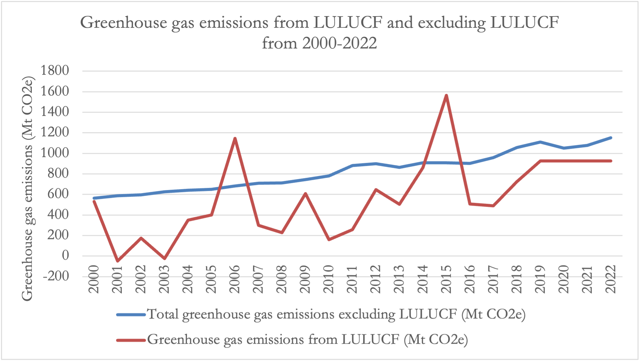Figure C. Total greenhouse gas emissions excluding LULUCF (Mt CO2e) (EN.GHG.ALL.MT.CE.AR5) and greenhouse gas emissions from LULUCF (Mt CO2)(difference between EN.GHG.ALL.MT.CE.AR5 and EN.GHG.ALL.LU.MT.CE.AR5) (World Bank, n.d.-a).