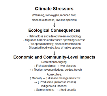 Figure 1: Conceptual flow diagram illustrating the pathway from climate stressors to ecological and economic impacts in freshwater fisheries.